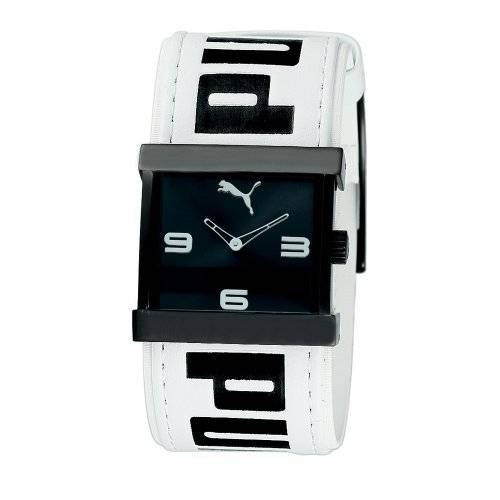 A polished combination of high fashion and sporty durability, the Puma Swap allows the playful swapping of bands to match your outfit or mood. Featuring analog-quartz movement, Arabic numerals at three, six, and nine o'clock, and the Puma logo at 12 o'clock, this dynamic watch is versatile and stylish. Bold, linear accents frame the top and bottom of the black dial, while the white leather band features the word Puma in bold, black letters and detail stitching up the sides. Also conveniently water resistant to a depth of 165 feet, the Puma Swap is a clever addition to the modern wardrobe.
