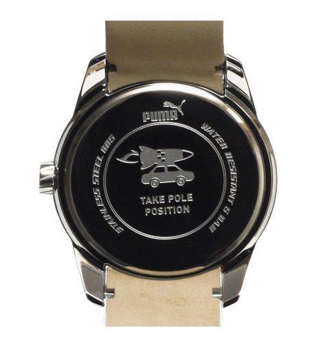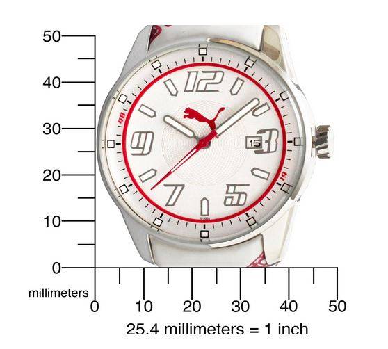 Sport watch, Quartz movement, Polished silver-tone hands with luminous accents and pink sweep seconds, Applied polished silver-tone Arabic numbers with luminous accents at twelve, three, five and nine o'clock, Applied luminescent polished silver-tone baton markers, Luminescent square markers, pink Arabic numbers and black indices mark surrounding minute track, Analog date aperture at three o'clock, Brushed silver dial with pink logo applique, White synthetic leather strap with pink Puma logos and oversized polished silver-tone stainless steel buckle, Polished silver-tone stainless steel round case, Textured steel crown with logo, Stainless steel caseback, Mineral crystal, 50 meters/165 feet water resistant