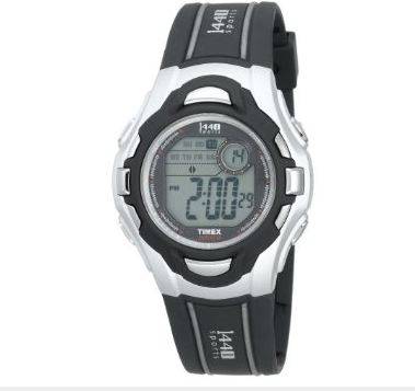 Large and in charge, this Timex 1440 Sports digital watch (model T5H091) features a full-sized, durable silver resin watch case with black top ring and easy-to-access side buttons. The dial features a large, easily readable digital time display, and it has an analog day-of-the-week display and large digital date readout at the top of the dial. Sport timing features include a 24-hour chronograph and 24-hour countdown timer. Other features include a daily alarm, dual time zone display, and water resistance to 50 meters (165 feet). It's completed by a buckle clasp. The Indiglo night-light uniformly lights the surface of the watch dial using patented blue electroluminescent lighting technology. It uses less battery power than most other watch illumination systems, enabling your watch battery to last longer.