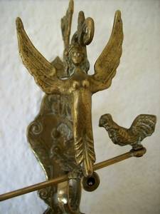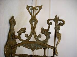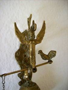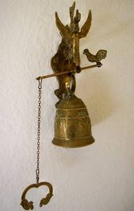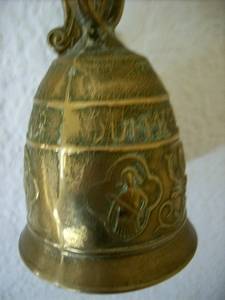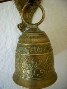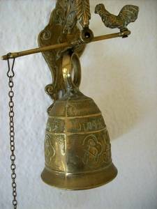A beautiful brass bell on an ornate bracket. This bell has a lovely tone is 110mm in dia and the bracket is decorated with various items eg angel, snakes, cock, the bell is inscrtibed with the latin words Qui me tangit, vocem meam-audit, roughly translated to mean " whoever touches me hears my voice " used perhaps in hallways to call people for vespers. This is a lovely bell. Bell & bracket height 325mm. Bell 170mm . Width from wall to end of bracket l50mm