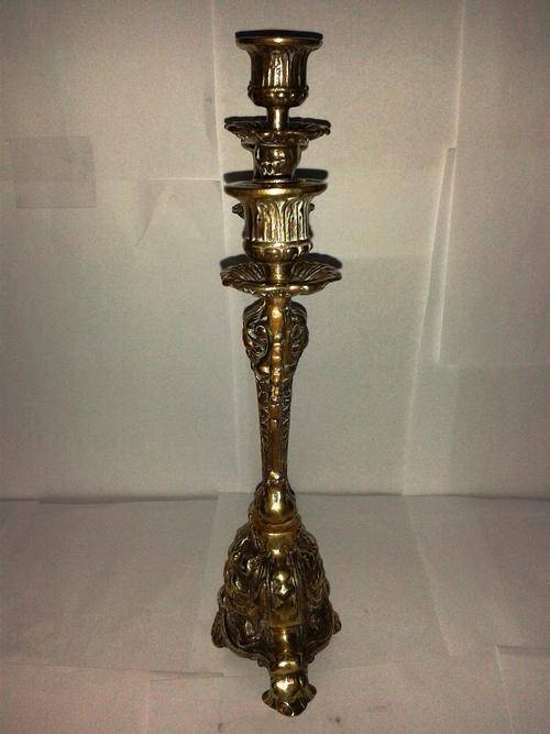 Striking brass candelabra with beautiful ornate detail. The candelabra makes an impressive impact in any setting. Solid, well made and brilliant cast work.