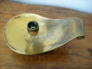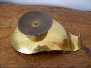 A heavy brass candle holder. This candle stick/holder is an unusual shape and apart from a good clean needed it is in good condition. It is approx 60mm high and 65mm long at its widest point.Â