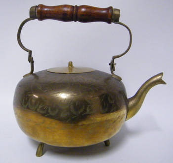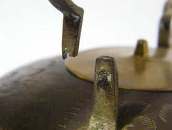 It stands 17cm tall to the top of it's handle and is about 18cm long to the end of it's spout. Notice the hinge on one side of the handle is faulty (see last pic below), resulting in the handle just resting on the hinge - Not noticeable when on display.