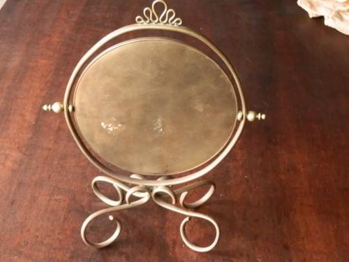 Brass mirror on stand, in good condition, mirror intact. The size of the mirror is 22.5 x 28 cm and that of the stand 9 x 15 cm.