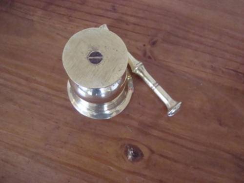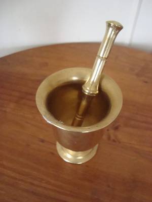 Small solid brass Mortar & Pestle, in good condition, a handy item , measures mortar 90mm high 75mm dia ,pestle 130mm long.