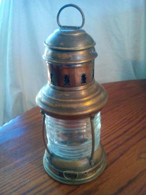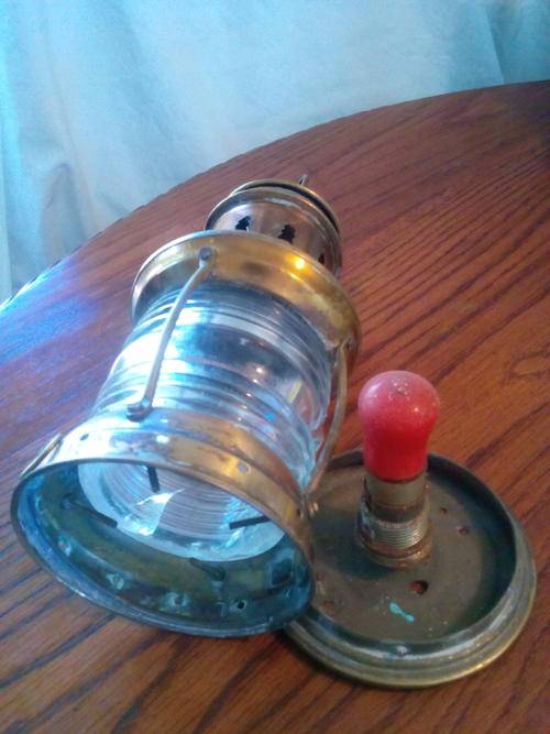 Tall circular brass lamp with inner glass case sandwiched between brass sections.Ribbed glass case housing light-has been electrified, but will need rewiring.Access to lamp is through base which unscrews.Glass has crack,but not obviously apparent.Stands 250mm tall and 105mm across base.