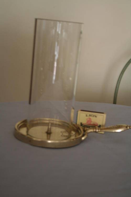 Flat candle stand with long handle, a spike to hold candle in place and a long glass cover to protect flame from the wind. Pictures for part of the description (Please see below) ~~ Please see picture for size comparison ~~