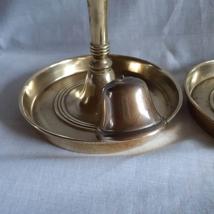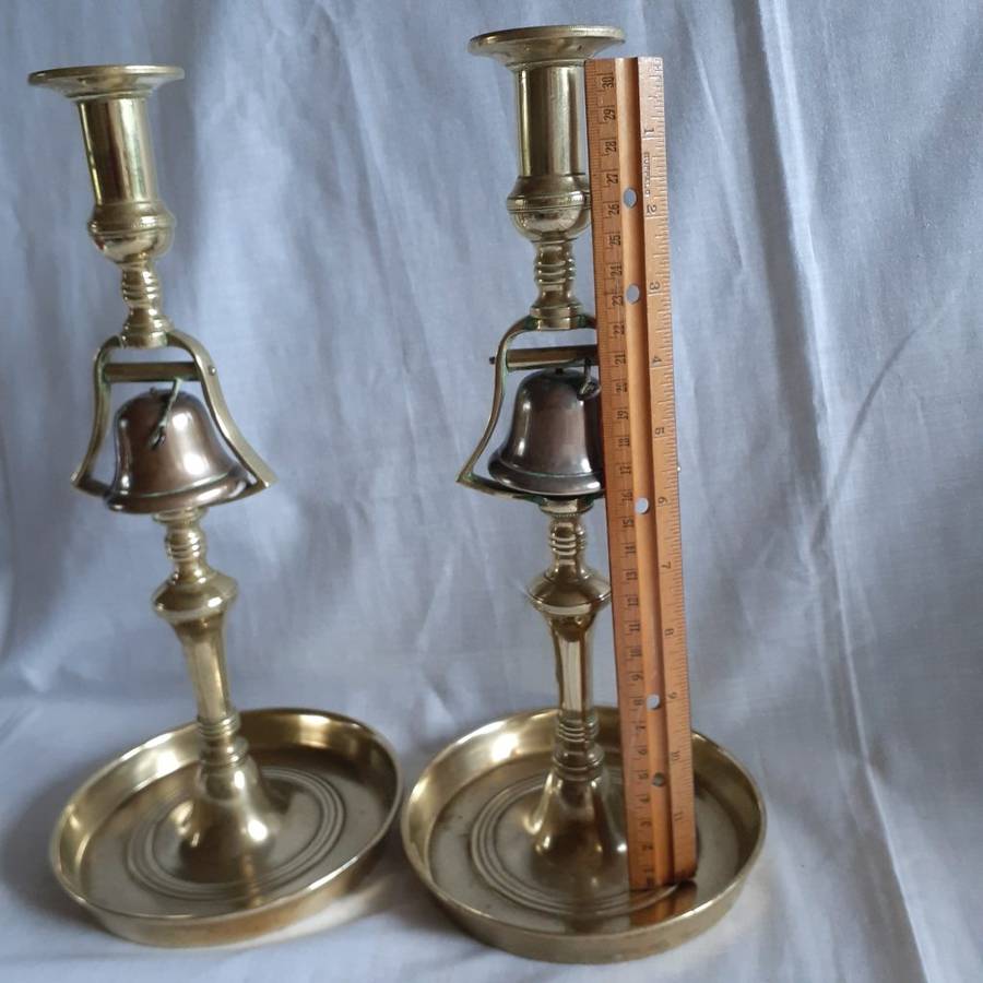 Info from internet: - These antique brass candlesticks were on tavern tables to summon the barkeeper to bring another round of drinks by tapping the bell.