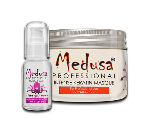 Medusa Professional Intense Keratin Masque infuses each hair strand with concentrated nutrients to deeply nourish from root to tip. Transformed from within, hair is wrapped in luxurious softness with increased manageability and shine. Nutrients penetrate deeply to rejuvenate hair from the core, improving and prolonging your keratin treatment.