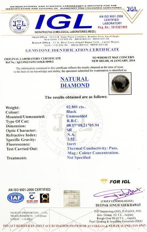Brazilian Carbonado REAL IGL Certified 2.80 Carat Round BRILLIANT CUT BLACK DIAMOND - AAA Grade!