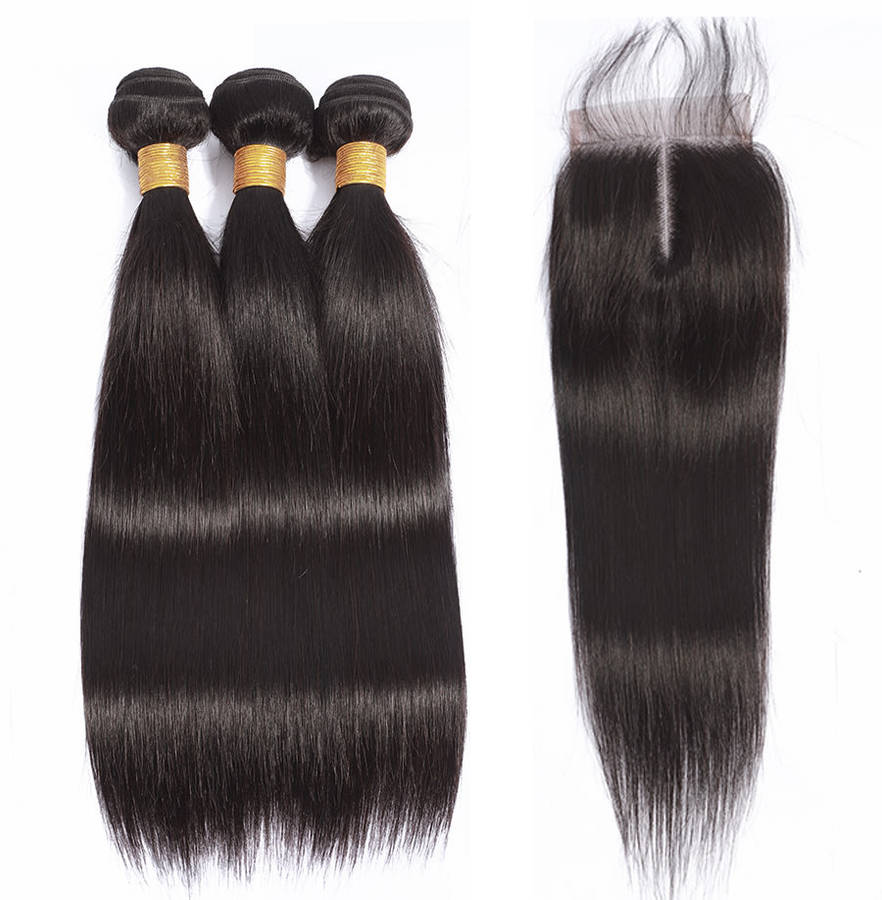 Item including: 3 bundles straight human hair weave (100g/bundle) 1 piece straight 4x4 lace closure