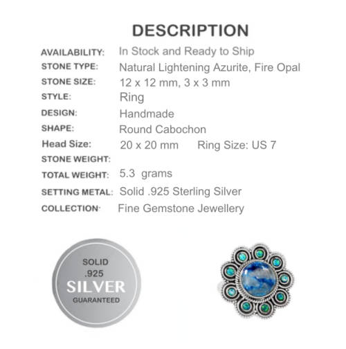 This beautiful unique ring has the awesome Lightning Azurite gemstone surrounded by Fire Opals. This lovely combination of gemstones results in a beautiful setting that will not disappoint.