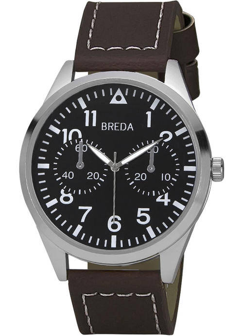 The Zach by Breda features a large black dial with white Arabic numerals and non-functional sub dials. The oversized bezel finishes the powerful feel of this watch. This watch sits securely on your wrist with a brown leather band. This watch looks great dressed up or casual and is sure to become a wardrobe staple.