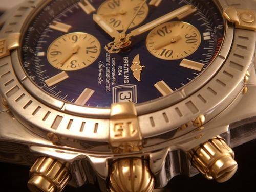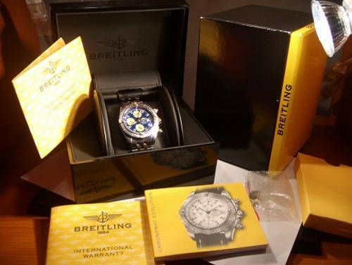 This is a Mens Breitling Chronomat Evolution in 18k yellow gold and stainless steel on a solid gold and stainless pilots bracelet. Ref. B13356. Beautiful blue dial with gold subdials. Gold stick markers. Automatic movement. Case measures 44mm. Excellent condition. Accompanied by its original box and papers, spare link, originally bought November 2006