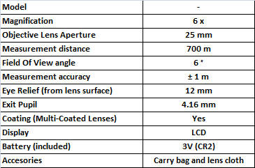 The Bresser 6x25 Rangefinder allows you to find the distance between you and a distant object. The compact and easy to use device provides information for objects up to 700 meters away. Unit readings are shown in yards or meters.