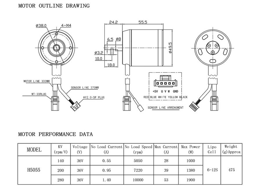 | 140 | 36V | 0.55 | 5050 | 28 | 1000 | 6-12S | 475 | |