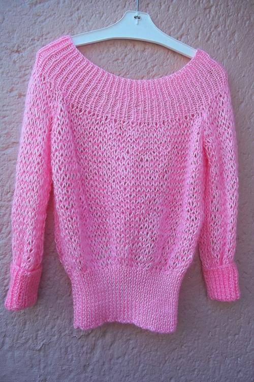 Bright Pink Off Shoulder Vintage Style Hand Knitted Sweater - Size 34