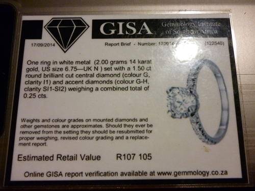 Brill. Round cut Diamond ring 1.5 Cts / G - I1 *Free Certification*