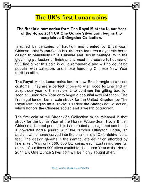 Created by the British-born Chinese artist Wuon-Gean Ho and struck by the Royal Mint, the dynamic horse design is symbolic to the unification of the Chinese and British heritage.