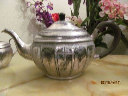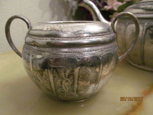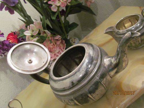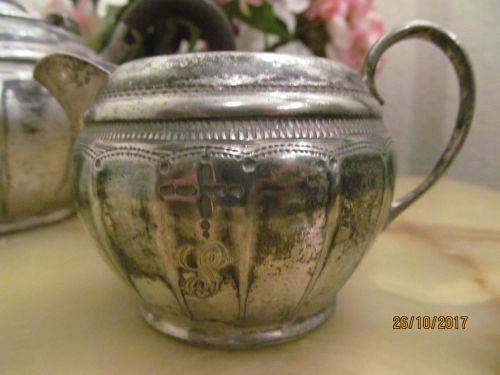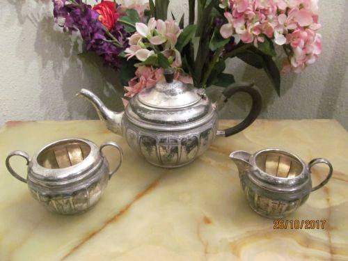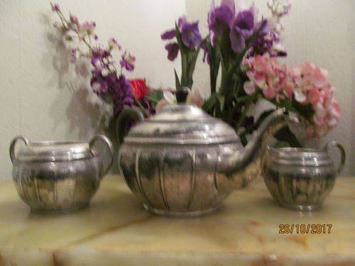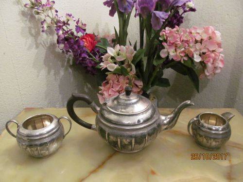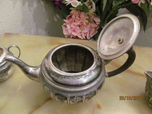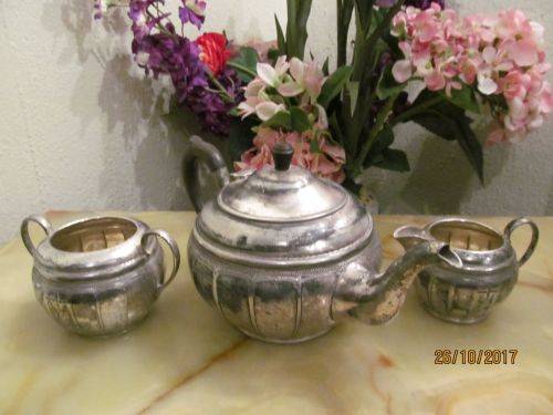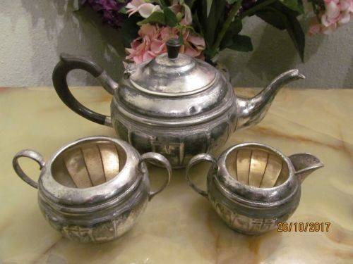 ANTIQUE 1890's ELECTROPLATED BRITANNIA METAL (BRITANNIUM) THREE PIECE TEA SET - TEAPOT, CREAMER & SUGAR BOWL
