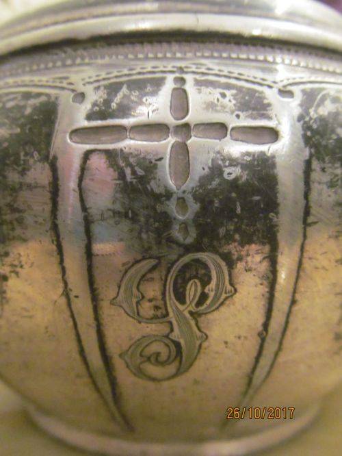THIS RARE THREE PIECE TEA SET CONSISTS OF A TEAPOT WITH A SCROLL HANDLE AND LID FINIAL OF BLACK BAKELITE AS WELL AS A CREAMER AND SUGAR BOWL, EACH WITH A GRADUATING SHOULDER AND REPOUSSE CRAFT LINEAR MOTIF. EACH ITEM ALSO HAS A CROSS SHAPED MARK ON EITHER SIDE WITH A CURSIVE LETTER BELOW. THE TEAPOT HAS A HINGED LID