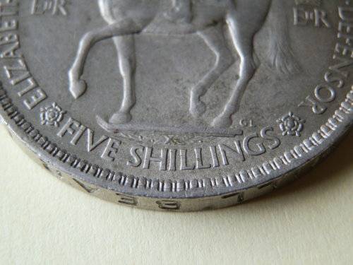 British 1953 five shilling coin, in good used condition. The weight is 28.4 g.