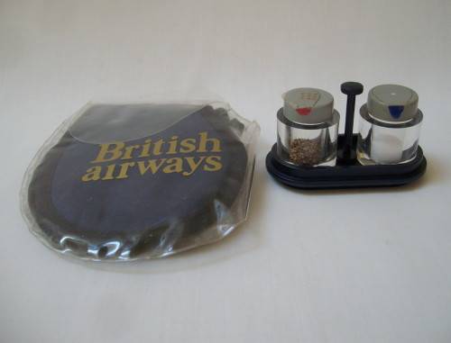 a sealed clear and grey plastic salt and pepper set on navy blue plastic stand.