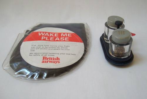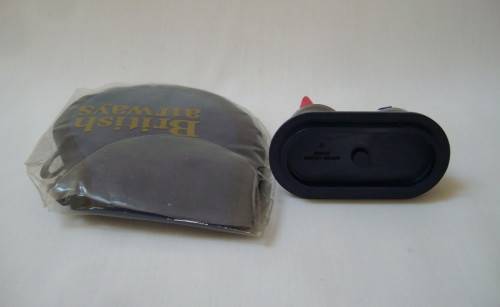 An navy blue eye mask and 'Wake Me Please' sticker in clear plastic pouch, with