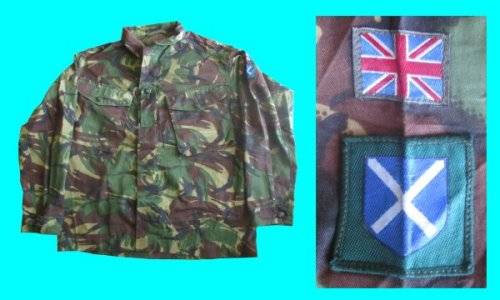 British Camo With Scottish Highlanders And Union Jack Insignia On Left Arm.