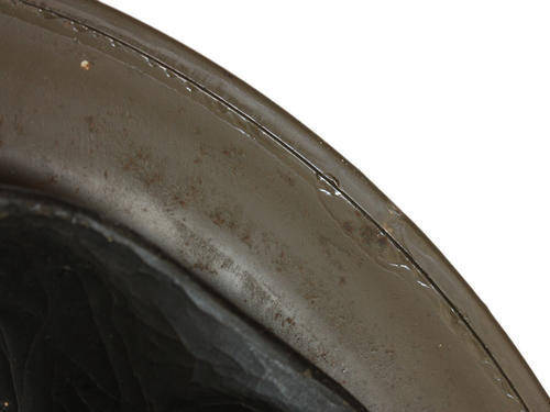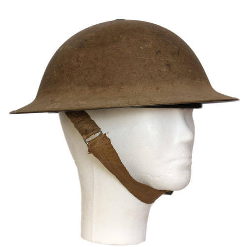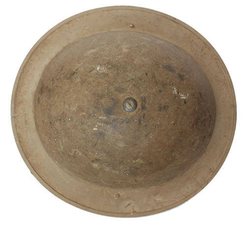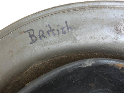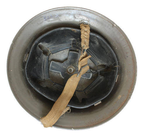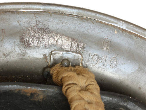 British MkII helmet. The RO & CO LM marking indicates the helmet manufacturer (Rubery Owen & Co Ltd of Leeds.) Rubery Owen made these helmets from 1939 to 1943. This one is stamped 1940. Someone has written "British" in marker. There is some glue on part of the rim under the helmet suggesting a minor fix (please see photo).