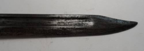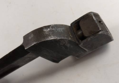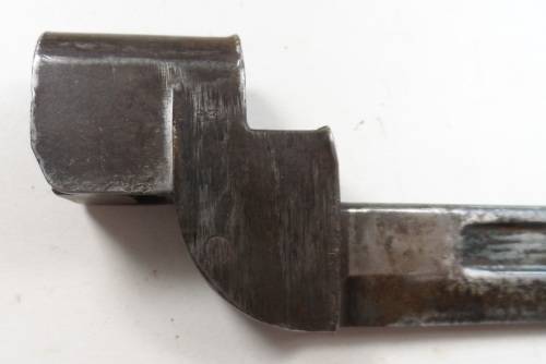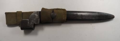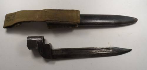 British No.9 Mk1 Socket Bayonet, with scabbard for use with .3003 Lee-Enfield no.4 Rifle. only marking on bayonet is M over 43. Both bayonet and scabbard have wear/marks on them. Release push button works.