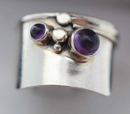 BROAD AMETHYST CABOCHON RING. UNUSUAL MODERN DESIGN! HANDCRAFTED FROM ENGLAND. HEAVY 4,8 grams!