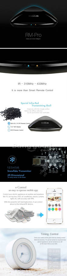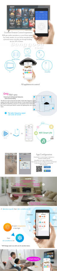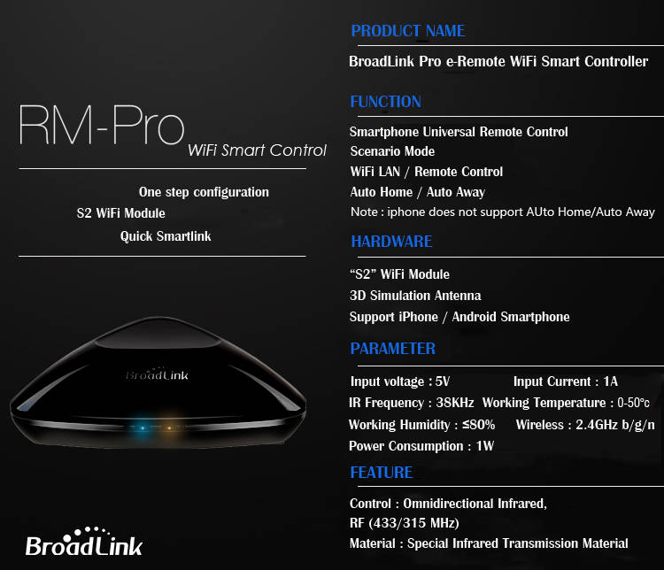 | Features | IR frequency: 38K; RF frequency: 433 / 315MHz; Working temperature: -20'C~60'C; Working humidity: <=80%; Wireless power consumption: <=0.5W; Wireless type: Wi-Fi 2.4GHz IEEE 802.11b/g/n; |