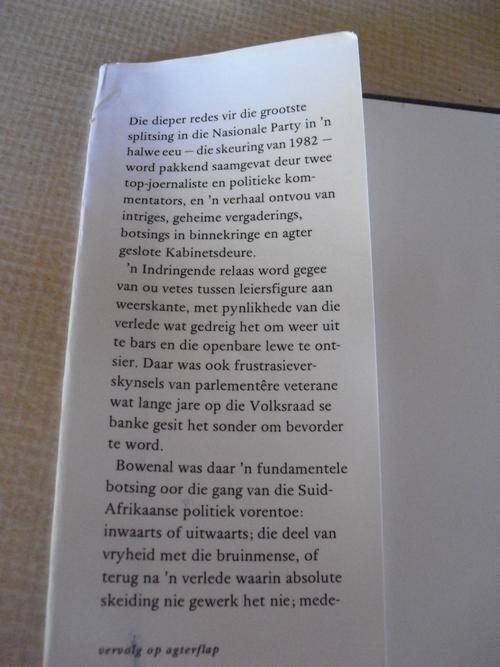 1982 Uitgawe in hardeband met stofjas. Boek is skoon en sonder merke. Boek stewig gebind. Die verhaal van die 1982-skeuring in die Nasionale Party.