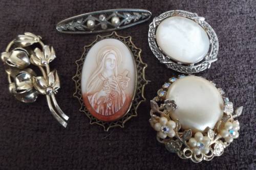 Lovely Old brooch's. One has MOP. One Pearl I feel may be real. One is an old earring which has been used as a brouch (see pic). Mother Mary Cameo. All in good condition. No stamps showing silver or gold. P&P R75.