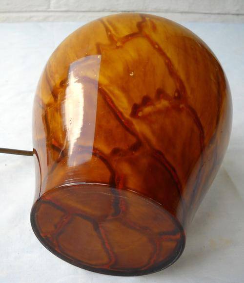 The glass base is predominantly brown to yellow at the top, with a large veination pattern in bubbles and darker browns.