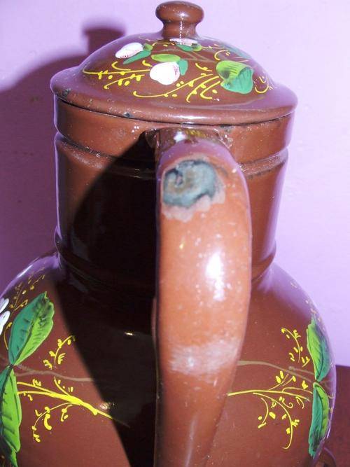 PRICE REDUCED! brown enamel COFFEE KONFOOR. really stunning flower detail. good condition with some enamel chips. tap drips very very slightly even when closed. original coal 'pan'.