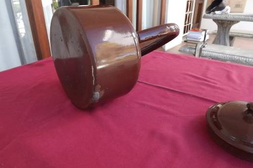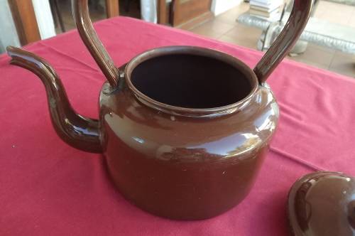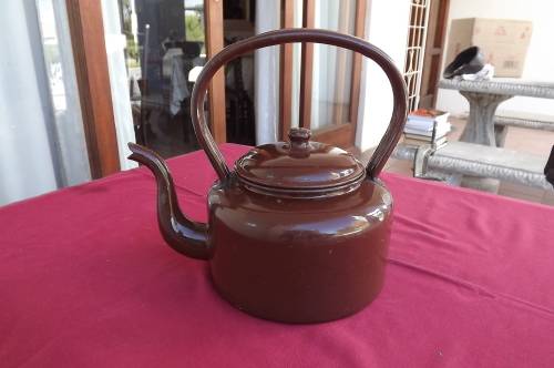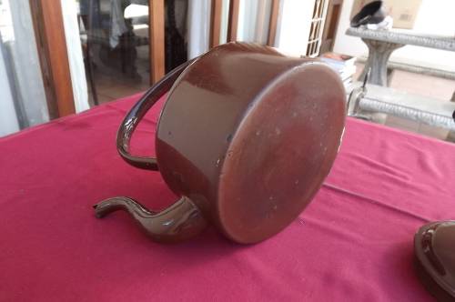 Brown enamel water kettle.Height 27cm bottom diam 19cm.Some rusting at buttom