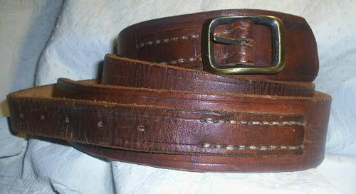 Broad brown genuine leather belt in very good condition. It is 4 1/2cm wide, 117cm in length and has an extra narrow piece of 20cm, would fit a 36 - 38 waiste. Has a brass looking buckle and I would say it is a unisex belt. THIS IS A MUST. Postage outside PE R45.