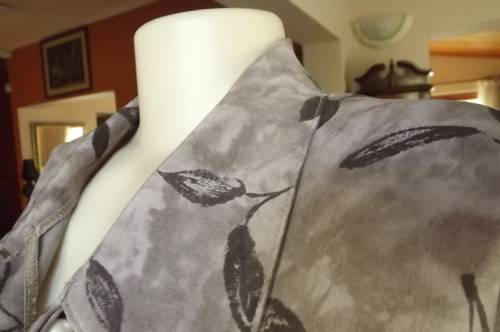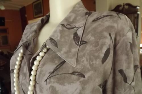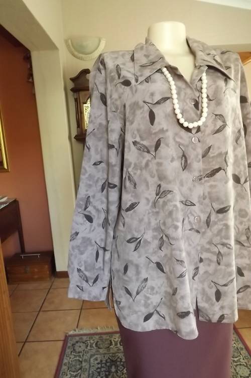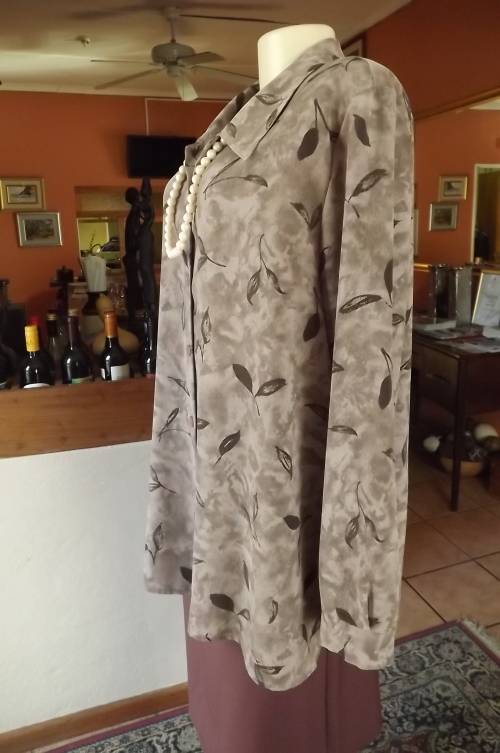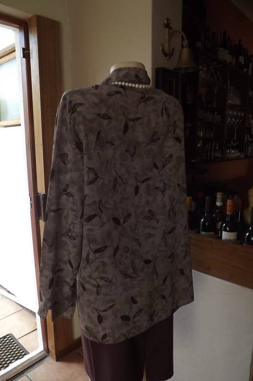 Brownpink mottled long sleeve blouse with leaf pattern.Size 44/20.Button down with shirt collar.