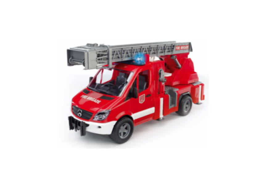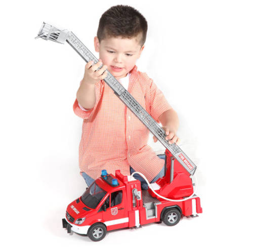 The MB Sprinter is still one of the most successful models in the small lorry category. Its universal application combined with a wide variety of upper bodies make it indispensable in trade, in the building industry, for local authorities, for landscaping and as emergency vehicles. There is an increased use of "smaller" fire-fighting vehicles to fight fires in hard-to-reach places such as narrow Old Town alleys. The Sprinter has proven well suited for this task thanks to its great mobility. BRUDER has developed such a fire service vehicle and included many realistic functional details. Special attention was paid to the fold-out turntable ladder with rescue basket and the fully functioning water spray including visible water tank and lifting cylinder. Snap-down stabilisers, various tool bins and the signal horn and light that function just as in real life complete the great fun factor of this vehicle.