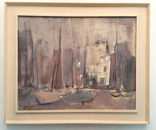 A stunning and old abstract harbor scene! This beauty measures 74cm x 59cm and the frame, which would require replacing, measures 90cm x 76cm. Own a treasure, bid now!