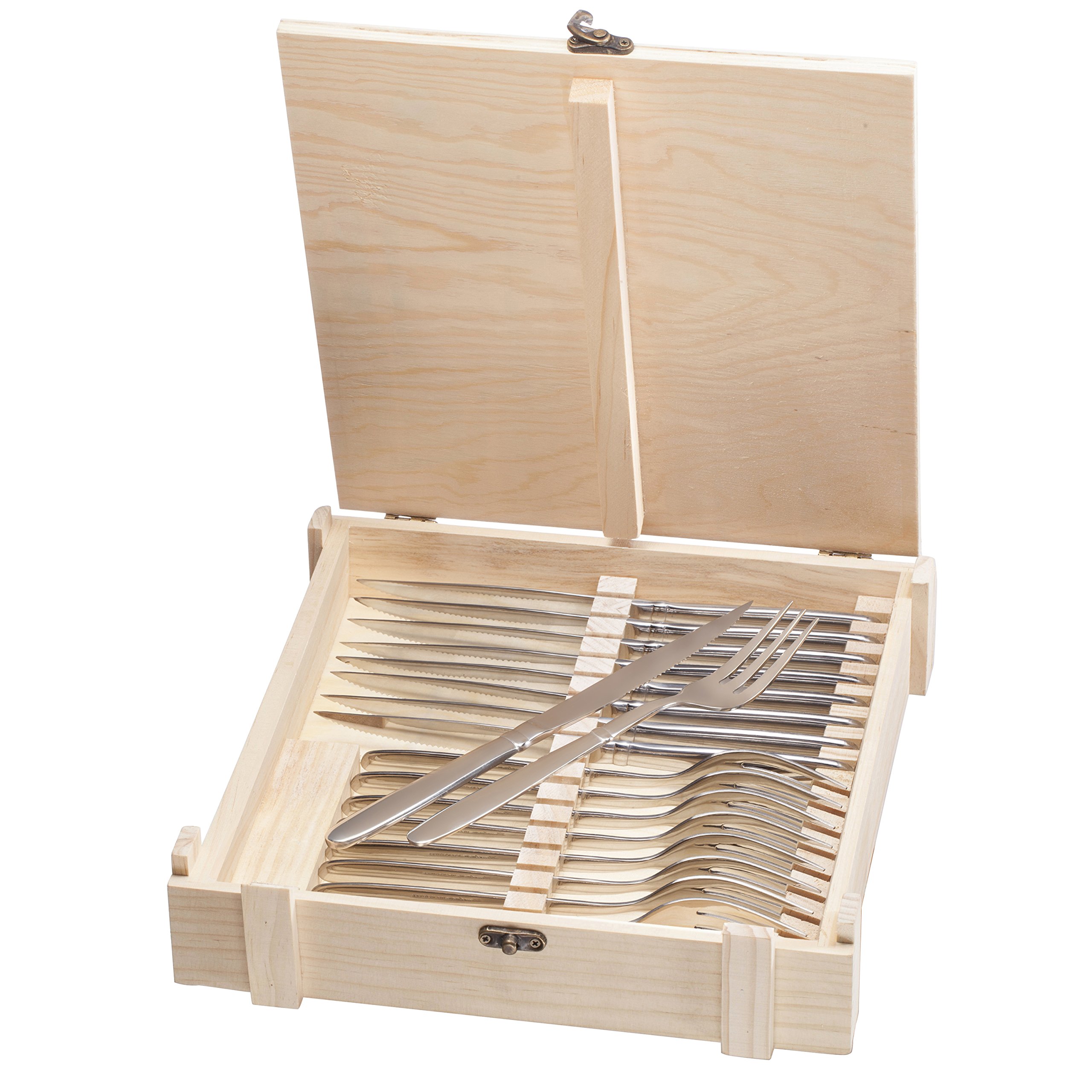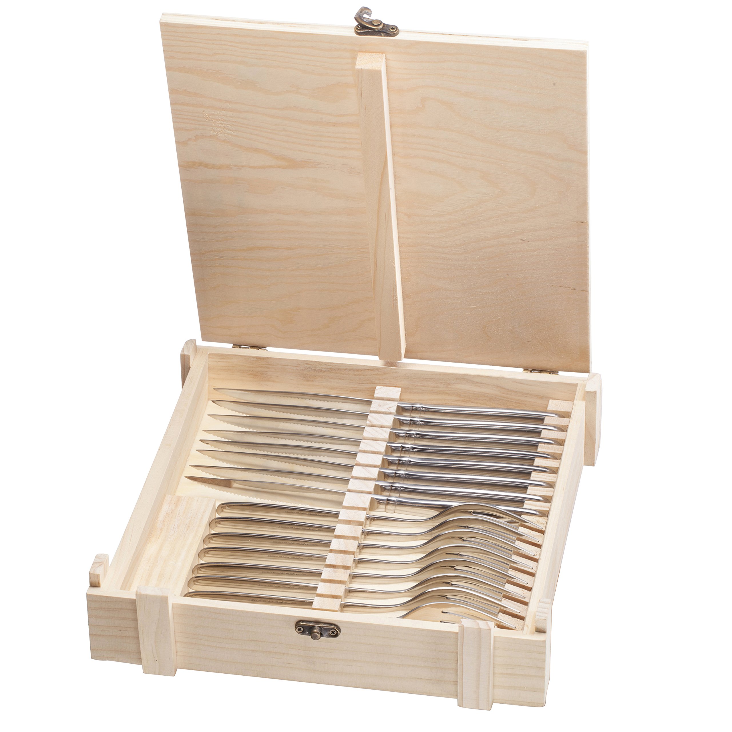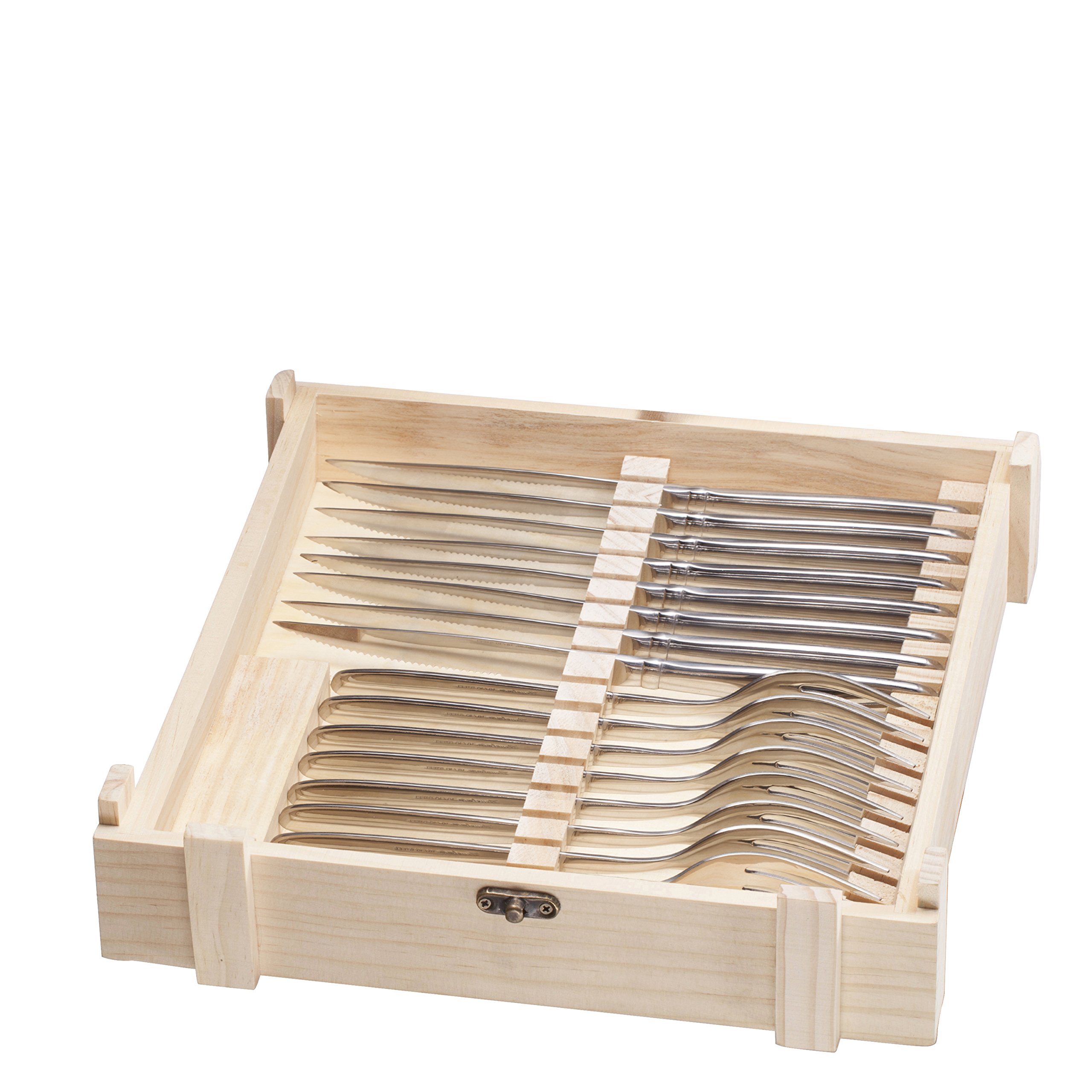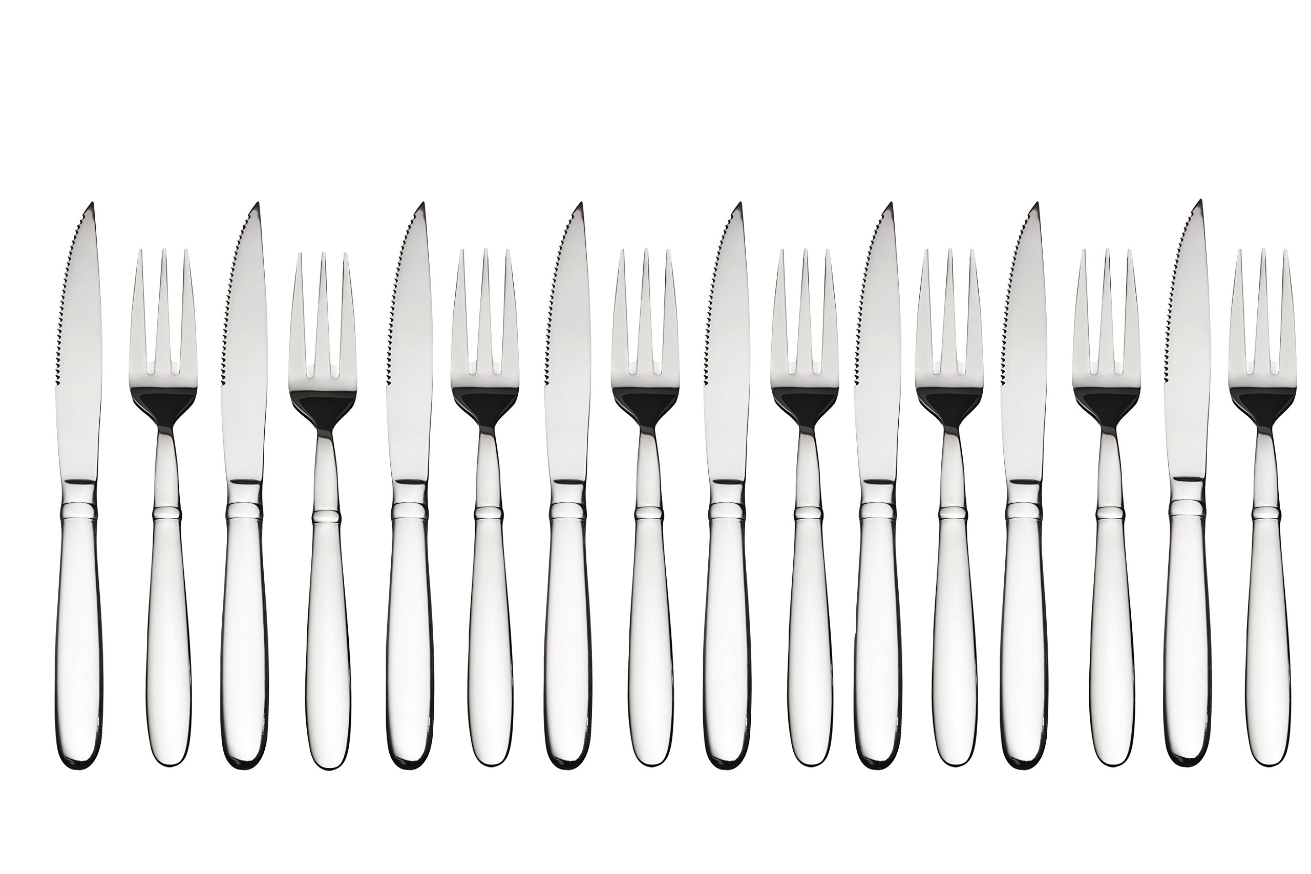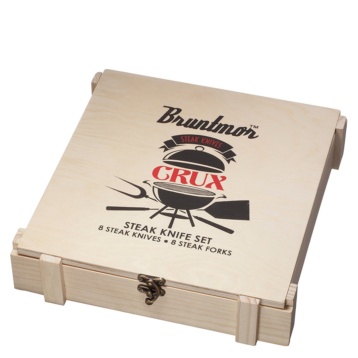 Bruntmor CRUX is a modern cutlery range with harmonious proportions. TheBruntmor CRUX Royal 16 Piece Steak Set is sturdy enough to stand up toeveryday use but also beautiful enough to grace the fanciest table. We workedhard to design a flatware set that gives you all the features you want at anaffordable price The sharp steak knife is ideal for grilled meats, crispy onthe outside and juicy on the inside tender. The steak knife has a particularlysharp blade made of special blade steel and is provided with a serrated edge.The handle is comfortable to hold in order to optimally be able to cut withthe steak knife. The prongs of the fork are finely sanded and meticulouslycrafted. Each part has a balanced weight and a comfortable grip shape and isthus particularly well in the hand. The shapely design of the cutlery piecesis timeless and addresses current and trend-oriented dining issues on. Thehighly polished surface gives the products an elegant appearance. . The highgloss polished quality in 18/10 stainless steel makes the articlesdimensionally stable, resistant against food acids, and of course dishwasher-safe. . It is both peaceful and beautiful in its simplicity. Due to itsunderstated appearance and discreet elegance, the cutlery is a harmoniousaddition to a modern d¿¿cor. It can be combined in a variety of ways. Stylisticfeatures: ¿¿¿ Modern length with balanced proportions. ¿¿¿ Carefully rounded edgesfor a pleasant feel. ¿¿¿ Can be combined in a variety of ways. ¿¿¿ Features:rounded edges at the end of the hand ¿¿¿ 16 Piece Value Set service for 8 ¿¿¿18/10 stainless steel that will never rust ¿¿¿ Dishwasher safe
