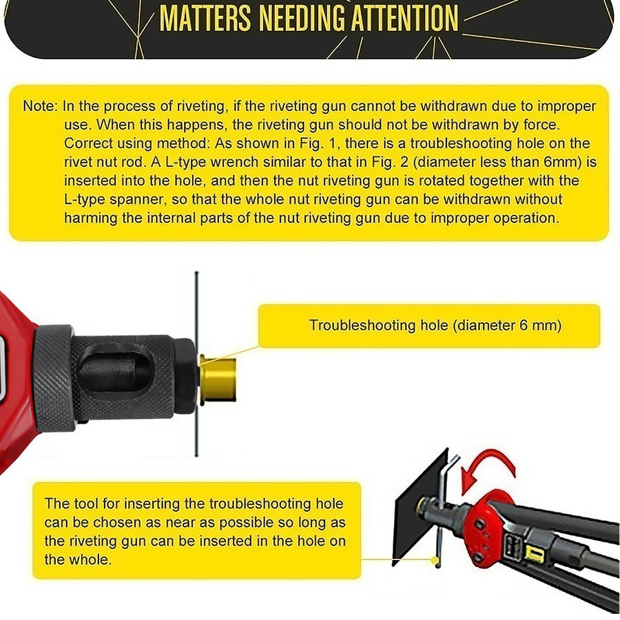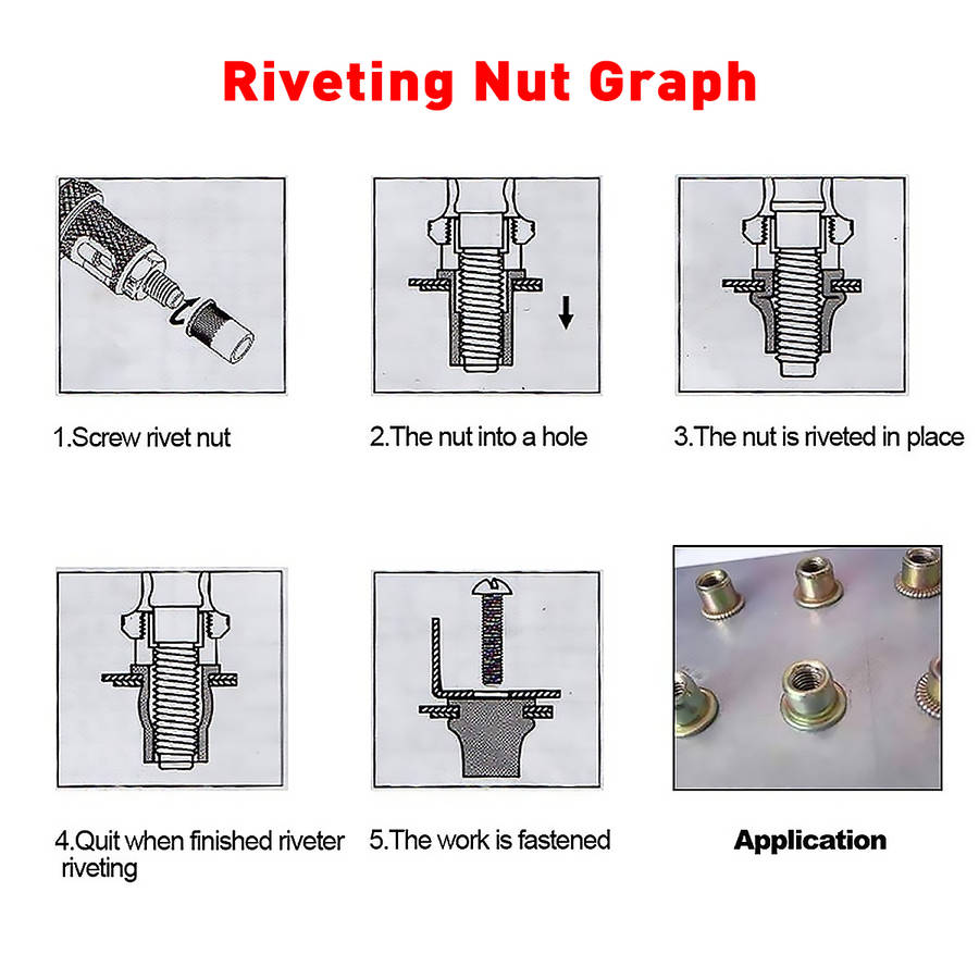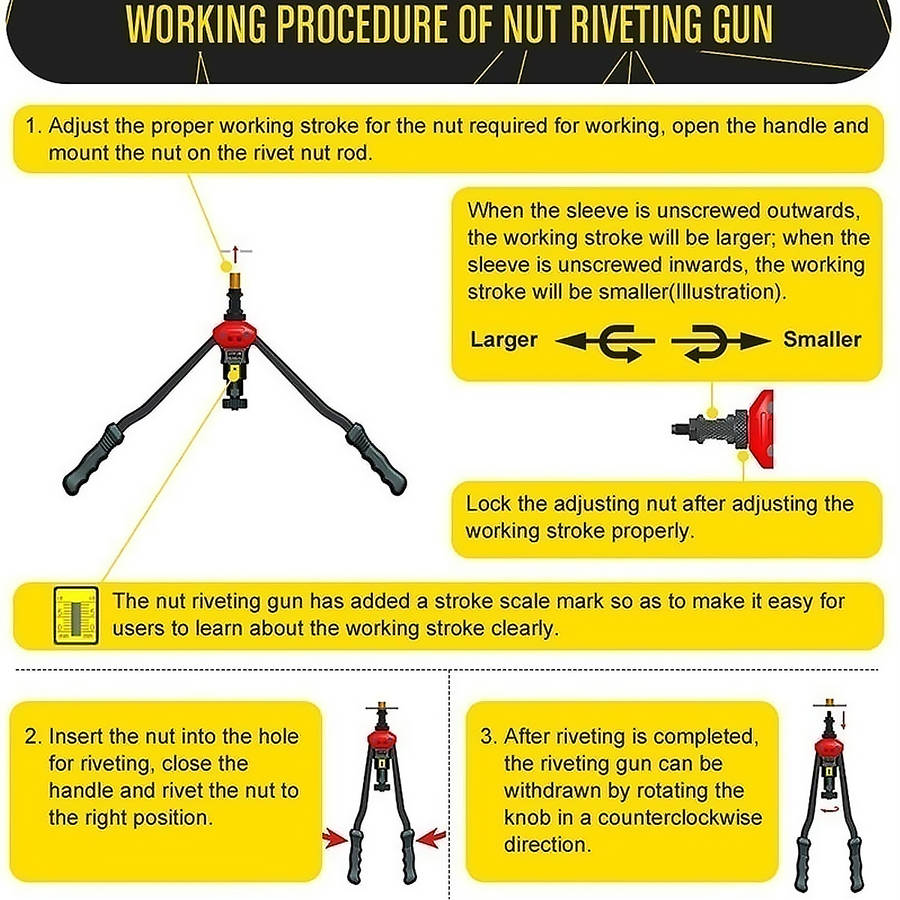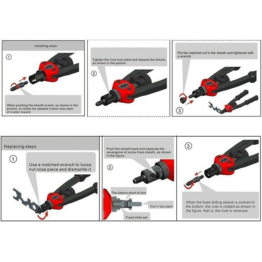 Description: This is the most labor-saving riveting Tool on the market. Ergonomic handles with double compound hinges maximizing leverage and for easy operation. Delicate Shape heavy duty hand riveter is ideal for working in hard-to-reach areas. Great for off-road / modifications Features: - Rivet nut range: M3/M4/M5/M6/M8/M10/M12 - The internal use of fixed sliding set to facilitate the removal or replacement of the screw - Hole of troubleshooting, easy to withdraw from stuck nut - Thickened heat treatment handle - Shockproof design eliminates the impact of the riveter on the arm during operation Specification: Rivet nut range: M3/M4/M5/M6/M8/M10/M12 Color: As the picture show Item Length: 30cm/11.8inch Package included: 1 x Rivet Nut Tool 7 x Replacement Part (M3/M4/M5/M6/M8/M10/M12) 1 x Wrench Details Pictures: