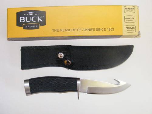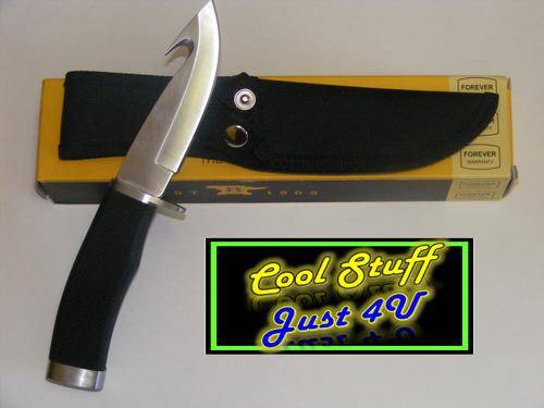 Textured, rubberized handle; Satin-finish butt and guard; Fixed-blade hunting knife with patented gut-hook for field dressing game ( skinning); Sheath included. Blade Steel : 420HC