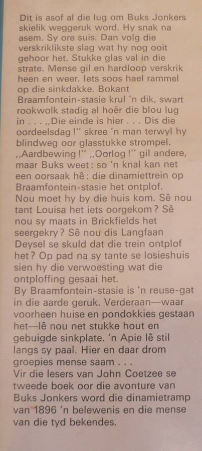 DEEL VAN JOHN COETZEE SE "BUKS" REEKS, DIE REEKS VOLG DIE AVONTURE VAN BUKS IN DIE JARE NET VOOR DIE ANGLO-BOEREOORLOG. WERKLIKE HISTORIESE GEBEURTENISSE WORD IN ELKE BOEK AS AGTERGROND GEBRUIK. BV. DIE RUNDERPES, DINAMIETRAMP VAN 1896 EN DIE JAMESON INVAL VAN 1895. PRAGTIGE BOEKE EN GOEIE MANIER OM JOU KINDERS AAN VROEE AFRIKANER GESKIEDENIS VOOR TE STEL.