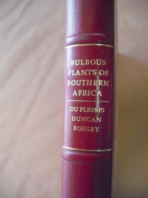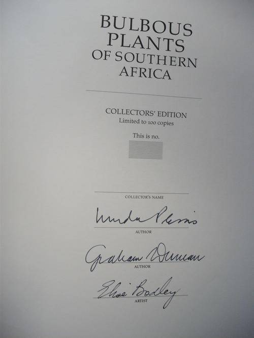 a 192 page Hardcover in Slipcase collectors ed. Half Morocco maroon leather spine & corners in pristine condition 1989- with maps & 47 colour plates &26 black & white SIGNED BY AUTHORS and ARTIST THIS IS LIMITED EDITION 100 COPIES this copy is not numbered see below BULBOUS PLANTS OF SOUTHERN AFRICA A GUIDE TO CULTIVATION &PROPAGATION