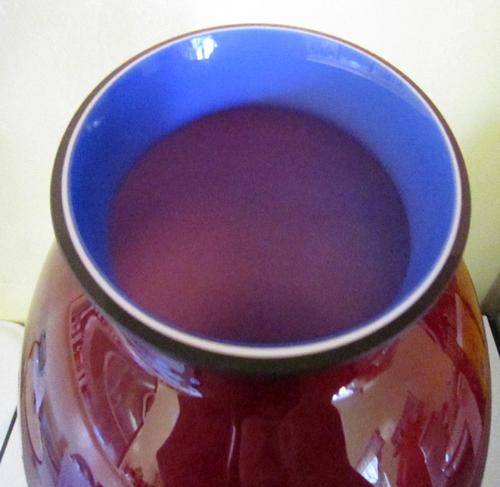 The vase is red but the middle layer is white & the very inner is blue, in certain lights the blue & red blend to give it a lilac colour! A truly special vase in perfect condition. Highest quality, made in Belgium. It stands app. 40cm's high & is app. 25cm's at its widest point
