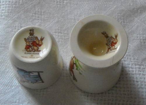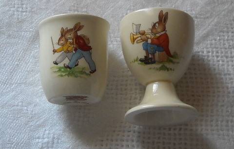 TWO lovely BUNNYKINS by Royal Doulton egg cups hand made and handpainted. Both have the Bunnykins/Royal Doulton stamps on the base. The little egg cup with the pedastel has a little 5mm blemish in the base of the porcelain, however this is not obvious untill you turn the egg cup over for inspection. Both still in excellent condition!! Postage R25