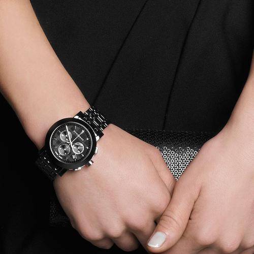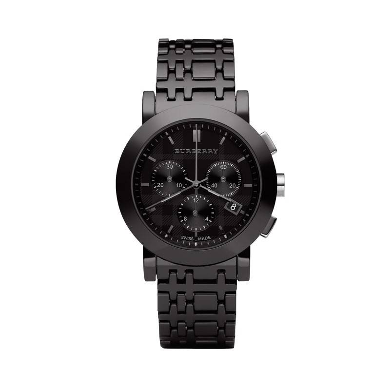 Super stylish Burberry unisex chronograph watch with a black ceramic case. The watch features a black checked dial with sub-dials at 3, 6 and 9 o'clock and a date display at 4 o'clock. The watch is secured by a Burberry nova effect ceramic bracelet and is water resistant to 30 metres.